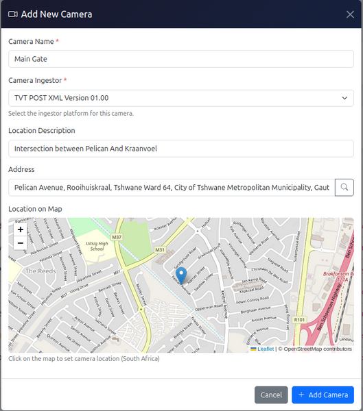 - Camera Ingestor – Select the applicable camera ingestor available for your account (Please contact us for list of available camera ingestors)